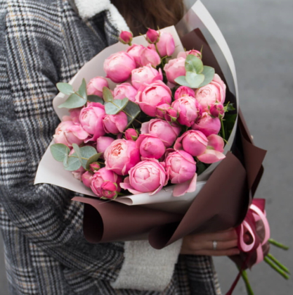 Нежный букет из пионовидных роз и эвкалипта в стильном оформлении.